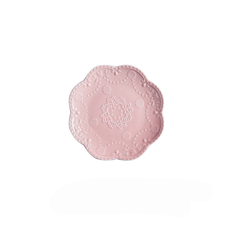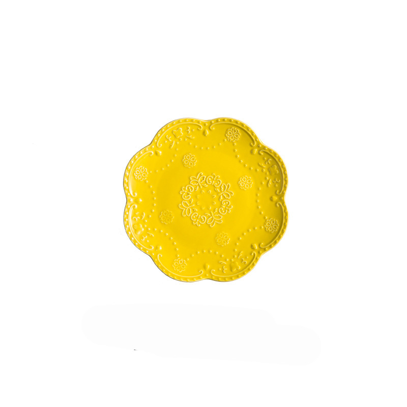 European Ceramic Glaze Western Dish Round Lace Embossed Cake Snack Cheese Plates Flat Plate Side Plates Buffet Tray