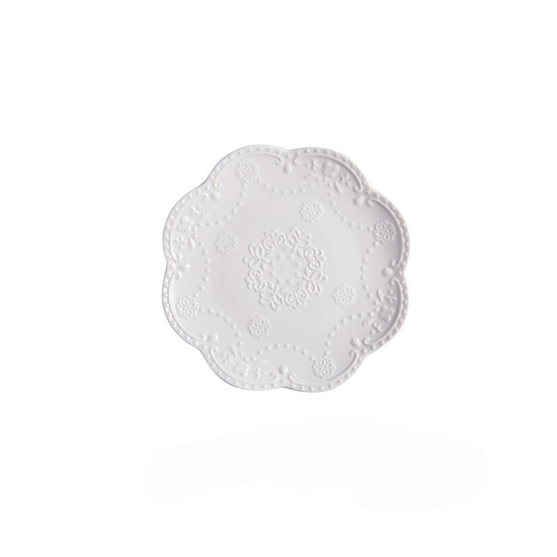 Home > European Ceramic Glaze Western Dish Round Lace Embossed Cake Snack Cheese Plates Flat Plate Side Plates Buffet Tray